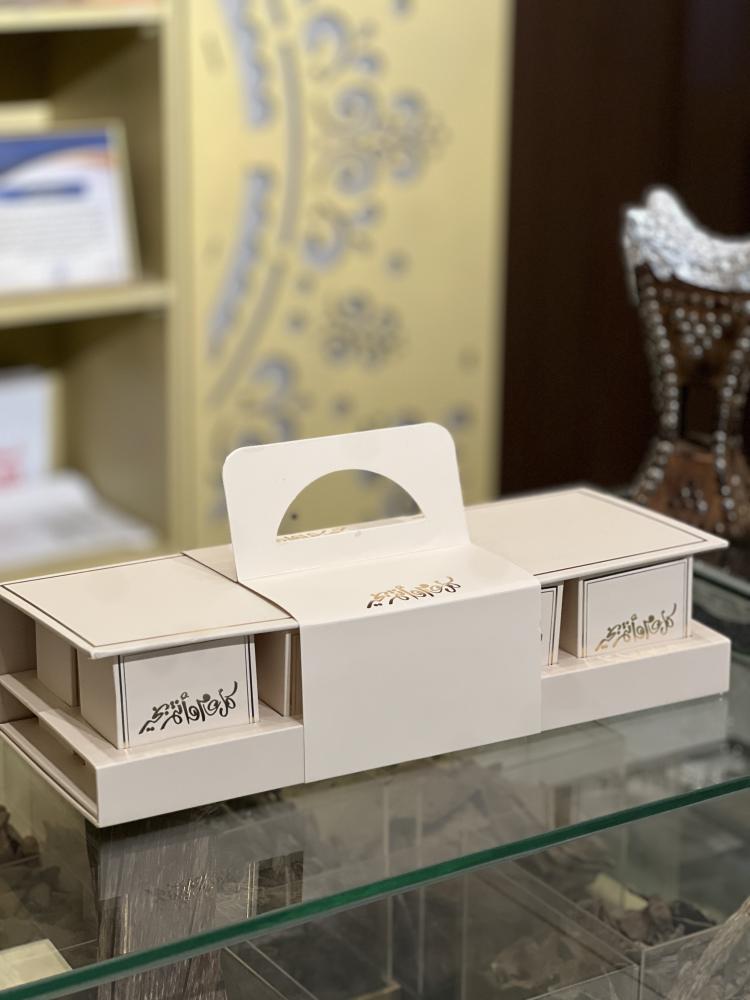 علبة فاخره جدا من التوزيعات معاها 8 علب في كل علبة كسره من الرقائق و ربع توله من المسك بأختيار العميل.